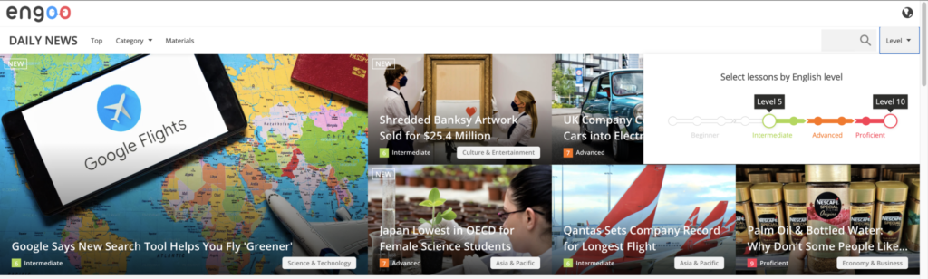 「Engoo Daily News」にて記事ごとにレベル別になっています。
