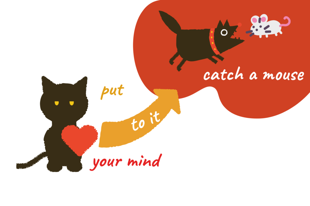 黒猫の例で言うと、「ネズミを捕らえる事:(it)」「に:(to)」「自分の気持ち:(your mind)」を「置く:(put)」という風に読めます。