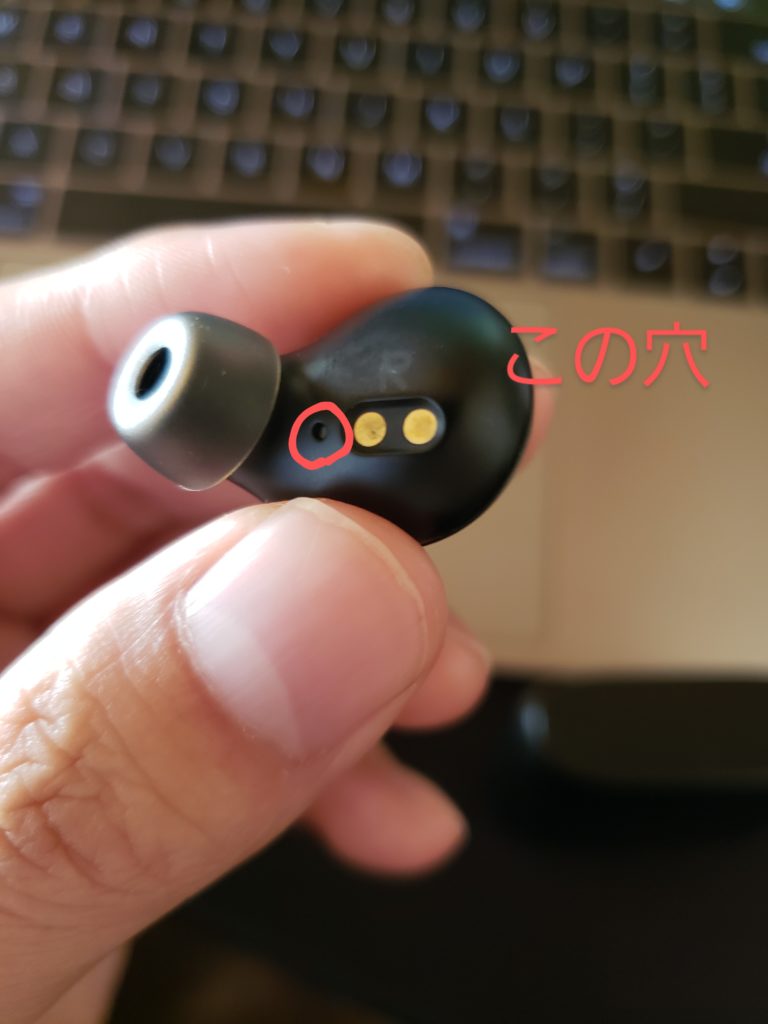 対処法は簡単で、上記画像に示した充電端子の横に付いている穴を掃除するだけです。